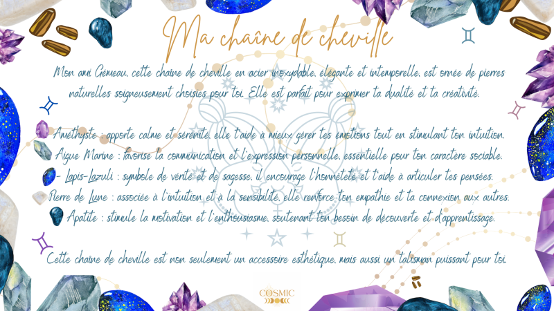 Mon ami Gémeau, cette chaîne de cheville en acier inoxydable est ornée de pierres naturelles soigneusement choisies pour toi. Son design élégant et intemporel fait de cette pièce un accessoire parfait pour exprimer la dualité et la créativité des Gémeaux.