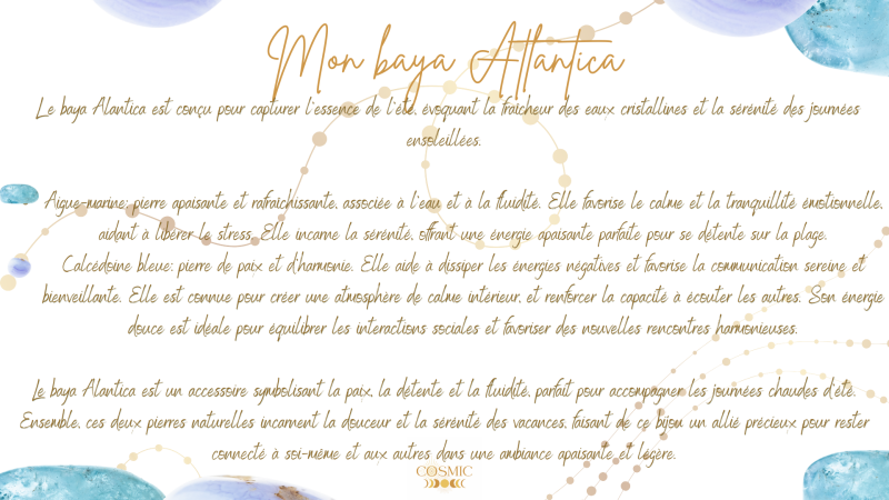 L'aigue-marine, avec sa teinte bleue claire, évoque la sérénité des océans, tandis que la calcédoine bleue apporte une douceur et une clarté apaisantes. Les coquillages ajoutent une touche organique et naturelle, rappelant la beauté des rivages marins.