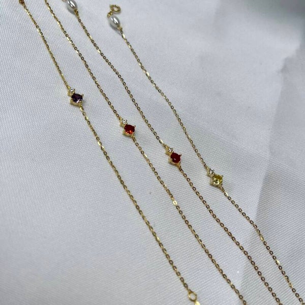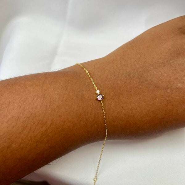 Un bracelet fin et lumineux en vermeil doré, orné d’une pierre naturelle (citrine, améthyste, grenat ou rubis).